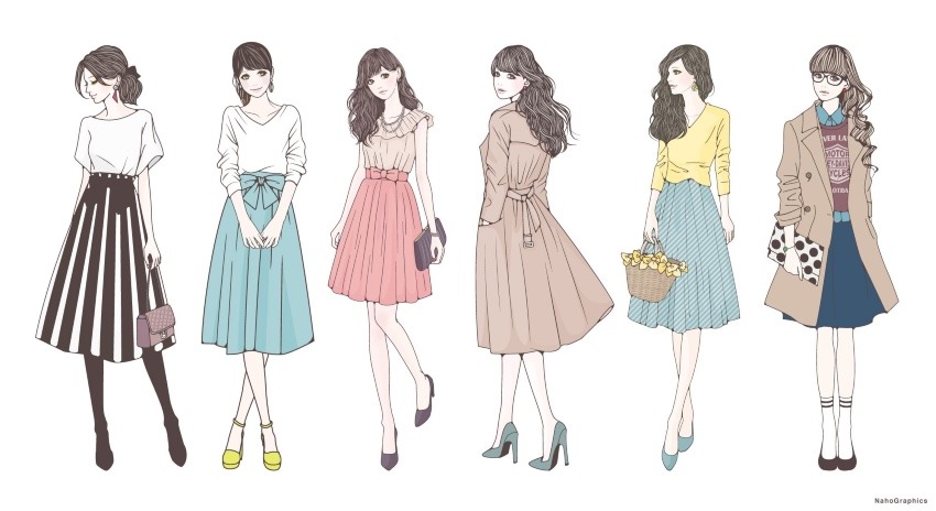 定番: カーディガン、ミニスカート、ワンピース、ブラウス